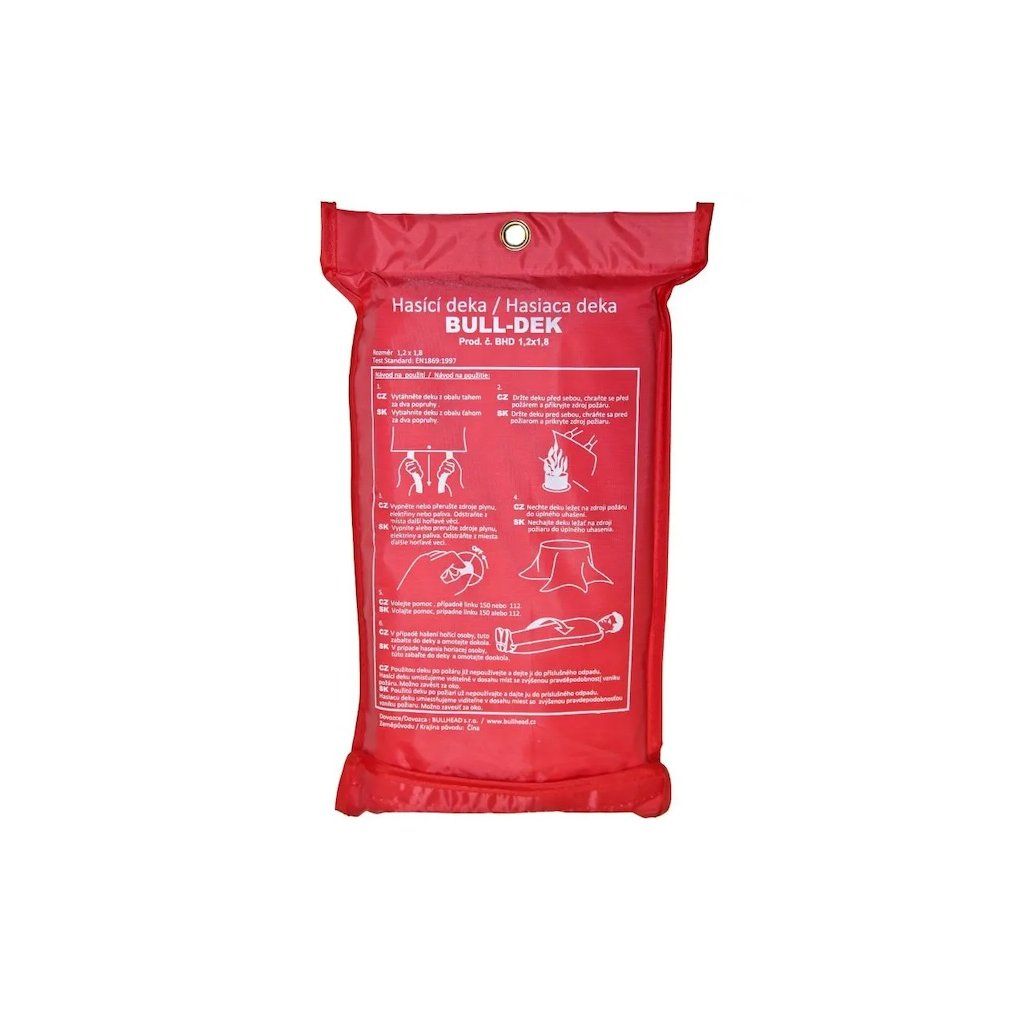 domácnostech, v dílnách, ve výrobě apod. Deka je vyrobena z nehořlavého materiálu - skelné vlákno. Deka je uložena v praktickém obalu s okem pro zavěšení na viditelném místě.