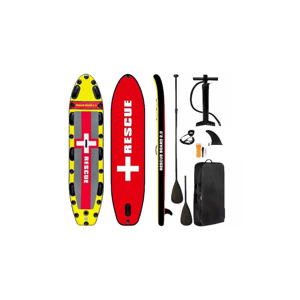Paddleboard WRE Rescue Board 2.0 Obsah balení: paddleboard, ruční pumpa, hliníkové třídílné pádlo, bezpečnostní lanko, transportní taška, klíč na ventily